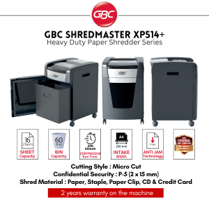 GBC Shredder XP514+ micro cut shredder is designed for moderate to heavy use with its high sheet capacity, large bin size and continuous run time.